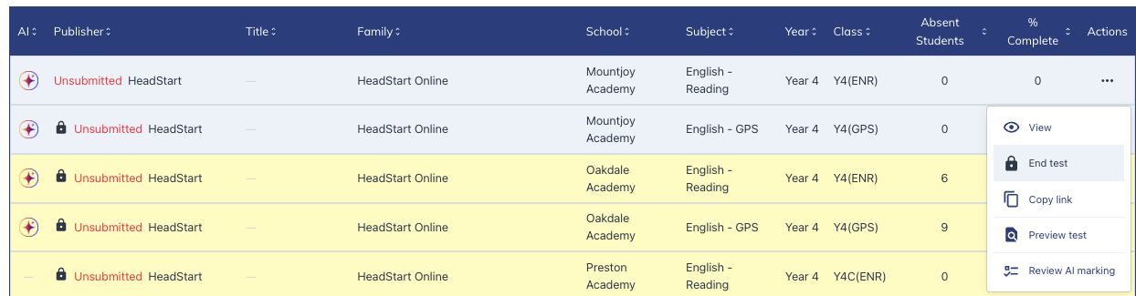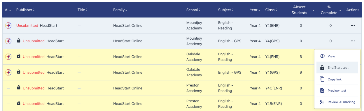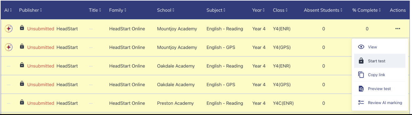 Teachers will unlock markbooks ready for students to sit their test by clicking "Start test", or "End/Start test" for a multi-part assessment where you can select which part you are going to make available to students.