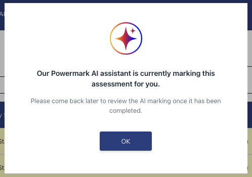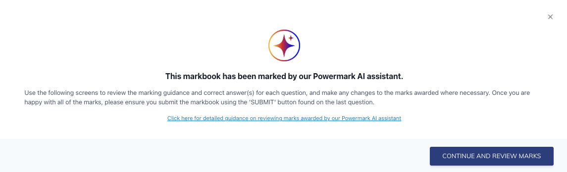 Once Powermark our AI marking assistant has completed the marking and the data has been verified (this will take around ten minutes), teachers can then moderate the marks by going to the markbook and clicking "Review AI marking". For a multi-part assessment you will be able to select which part you would like to review marks for.