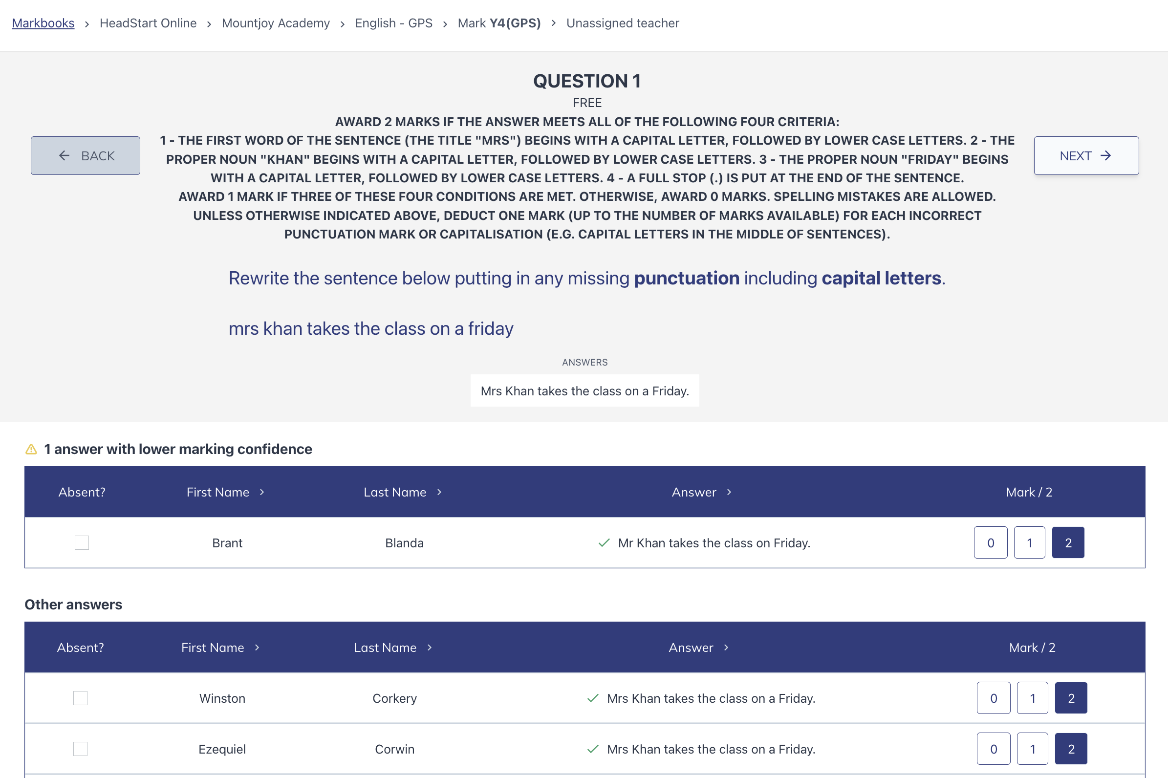 Marks can be adjusted for any answers as required. Once you are happy with all marks awarded, you will then need to submit the markbook using the "SUBMIT" button found on the last question.