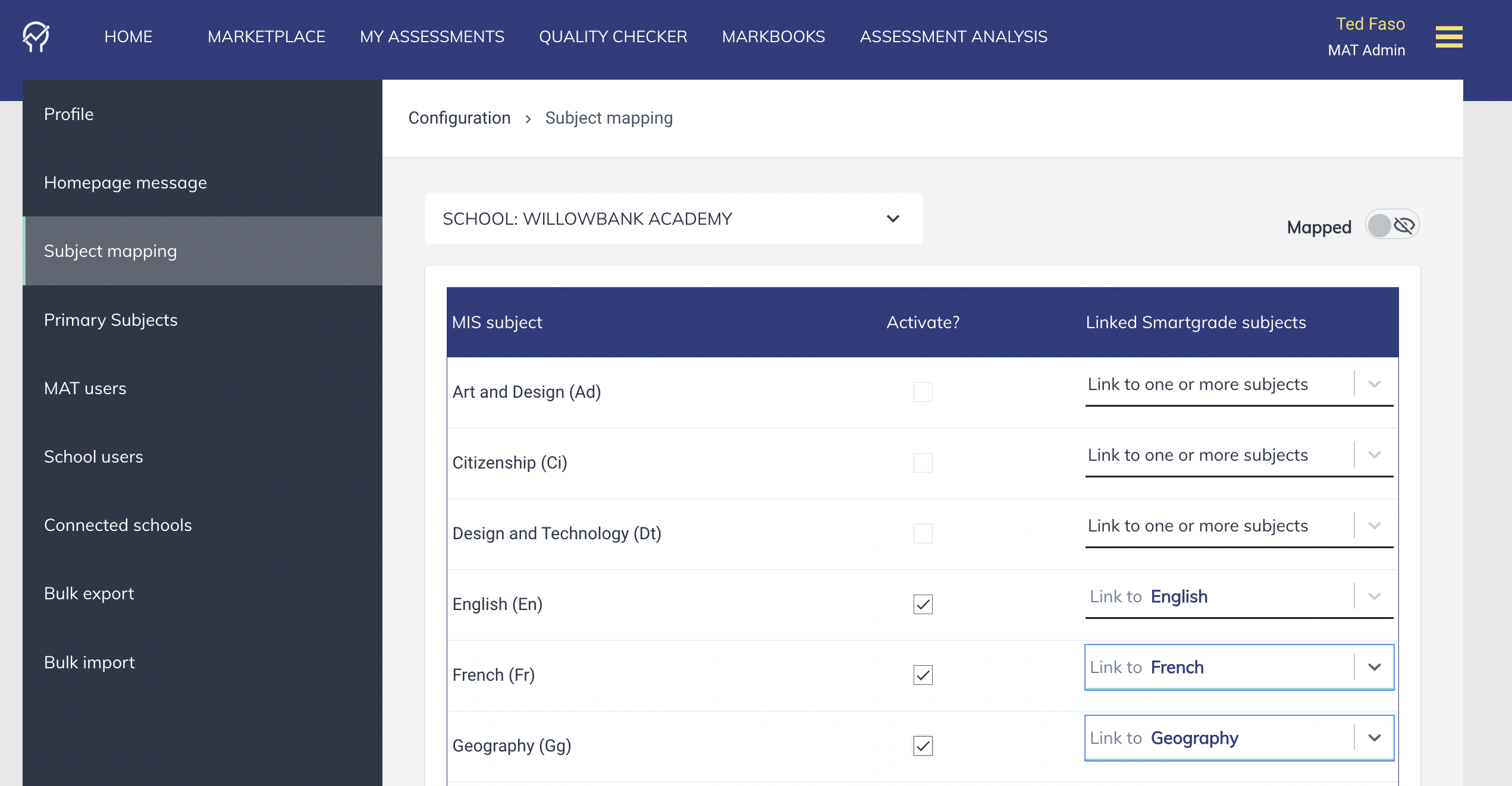 When you first start using Smartgrade at the Secondary phase, you'll need to make sure we understand which subject codes you use in your MIS, and how they map to Smartgrade subjects. You also need to "activate" subjects you're using Smartgrade for, as this controls which teacher accounts show up on the School Users tab and which assessments you can use.