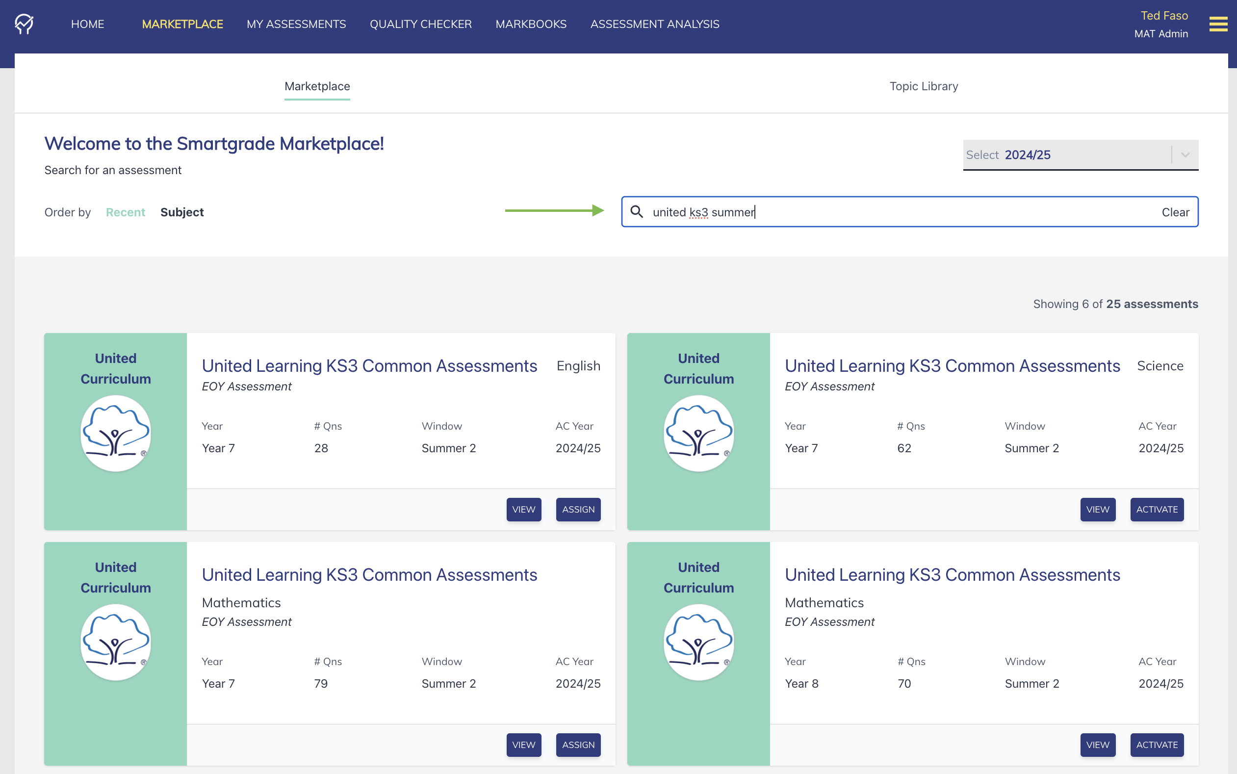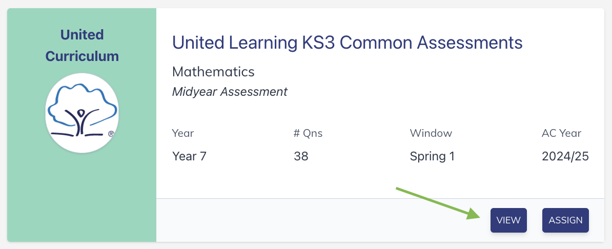 Search for the assessment you wish to assign using the Search Bar. Top tip: Search for "United" and the term of the assessment, e.g. "Summer". You could also use the Year Group, subject name and/or Key Stage e.g. "KS3" or "KS4".