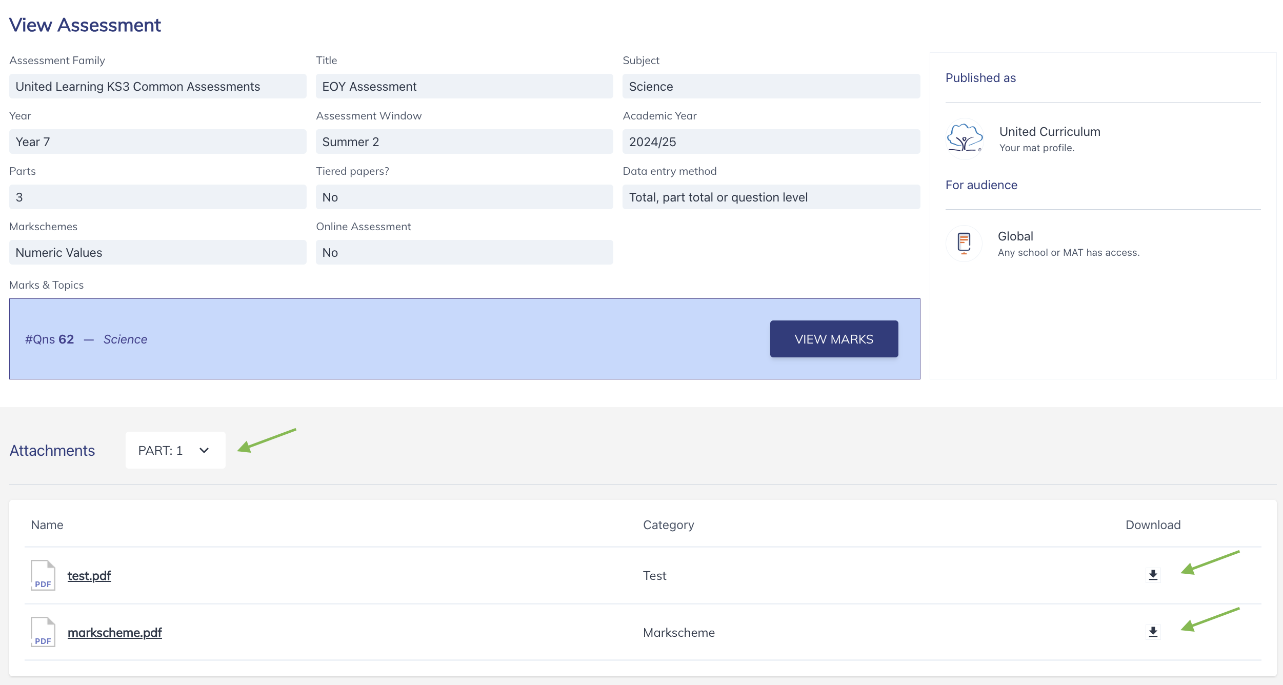 Towards the bottom of the screen are the Attachments where you can find the test papers and markschemes. Simply click on the download icon to download the papers as required. Note: for assessments with more than one part, use the Part drop-down to access additional test papers and markshemes.