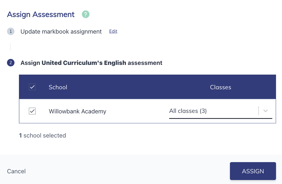 - You will see a class or a list of classes available for you to assign in the "Assign Assessment" modal. Ensure there is a tick next to any classes you wish to create a markbook for and then click ASSIGN. Note: all classes for your permission level will be available. If you are a MAT Admin you will see all available schools and their classes in your MAT as in the screenshot below.