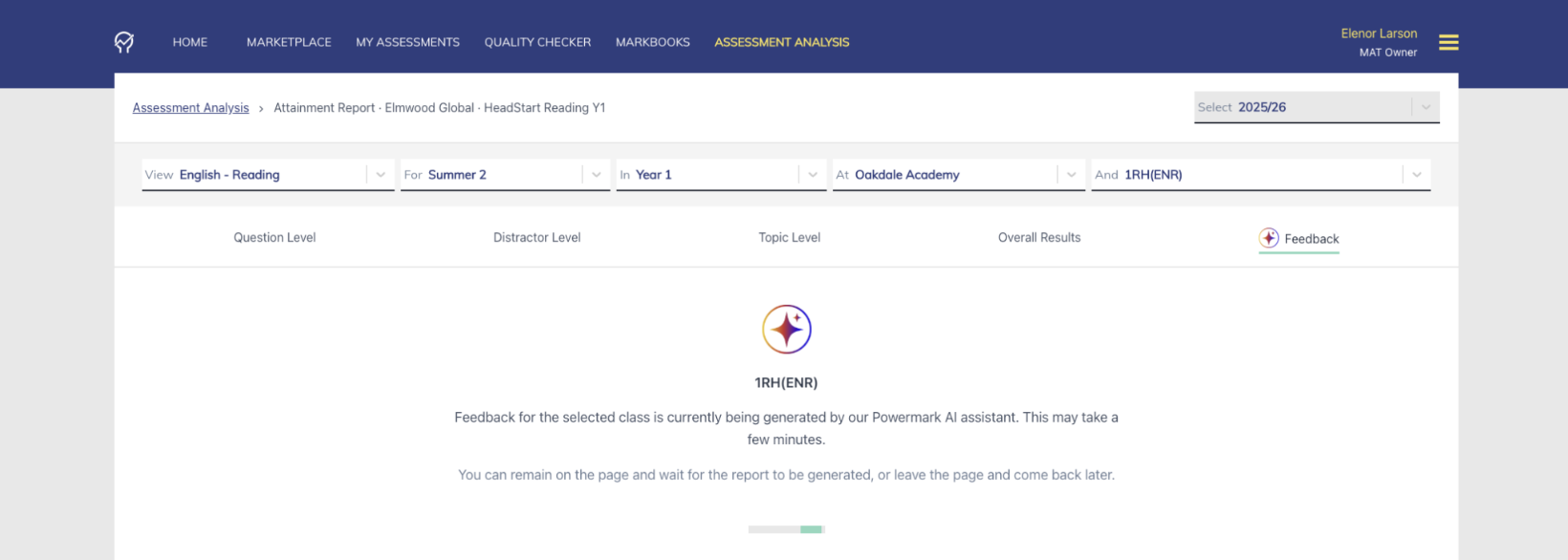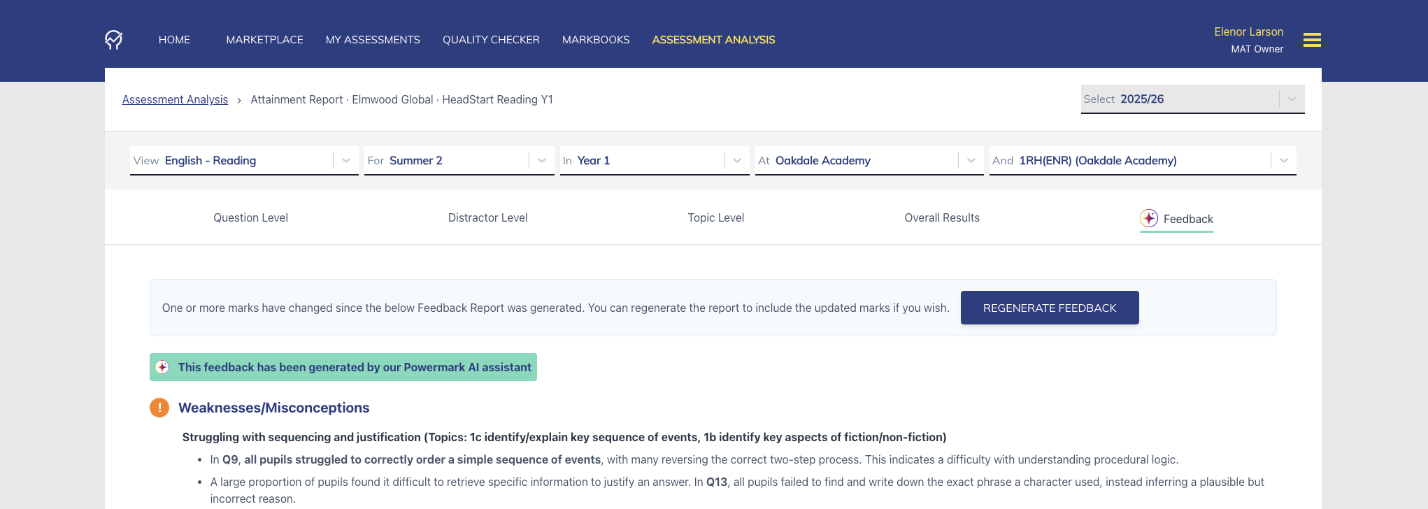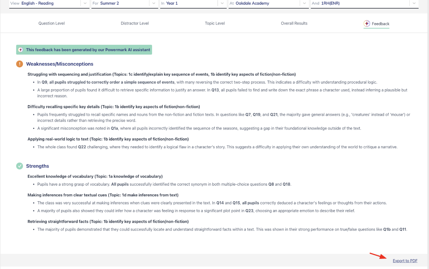 Aggregated feedback reports for assessments marked by Powermark, our AI assistant, are available within Attainment Analysis. These reports summarise the performance of students in the assessment and generate key strengths and weaknesses/misconceptions.