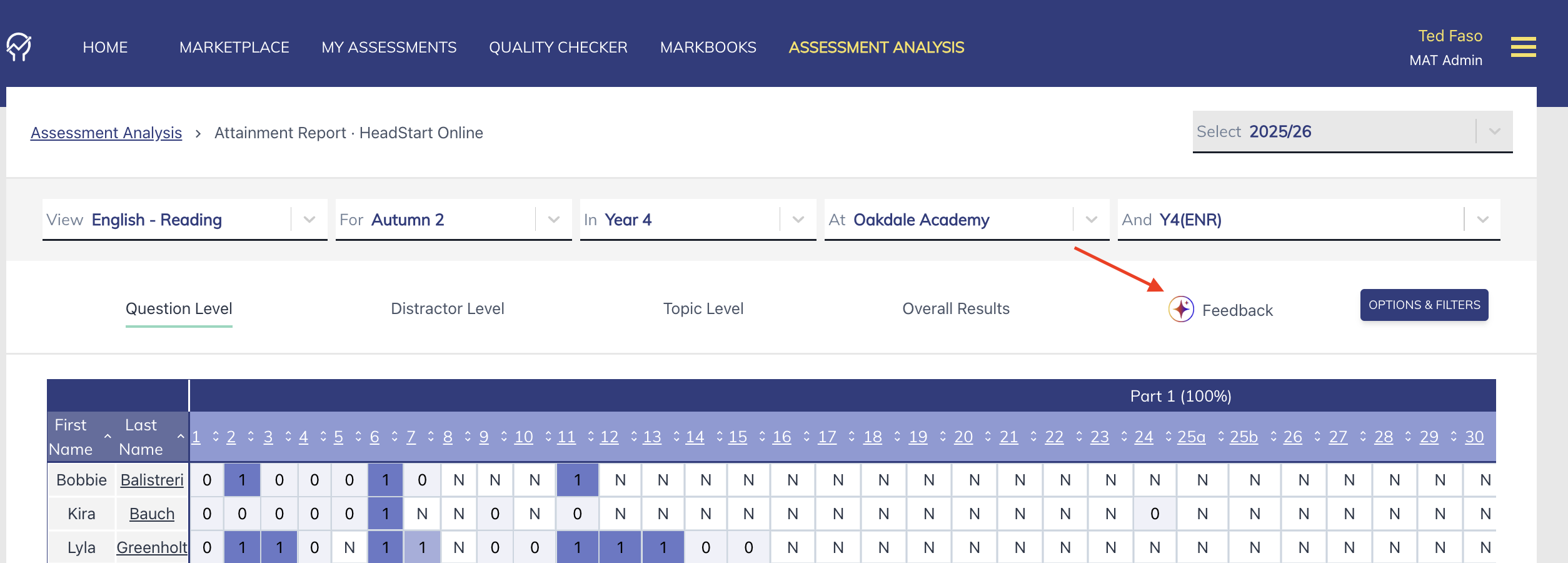 Open Attainment Analysis and, where an assessment has been marked by Powermark, select the Feedback tab: