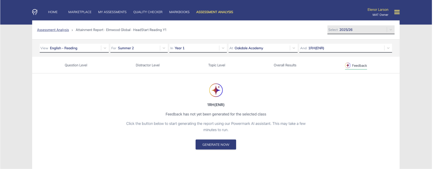 If you have not already generated a feedback report for the selected class/assessment, click Generate now. The report may take a few minutes to generate.